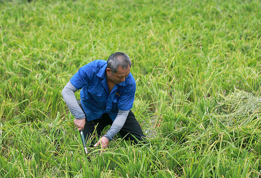费道湘在进行再生稻的管护