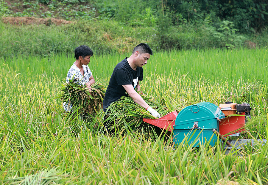 附近一块水田里,在外务工的村民李君专程从县城里赶回来,收割自家的两亩稻谷。他和母亲用镰刀把稻穗割下来,然后用微型柴油打谷机脱粒。孩子在田边饶有兴趣地“观摩”,准备暑假的作文。