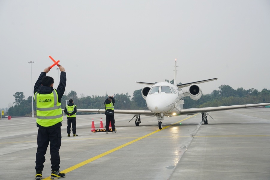 乐山机场迎来首架校验飞机降落(李庄伊 摄)