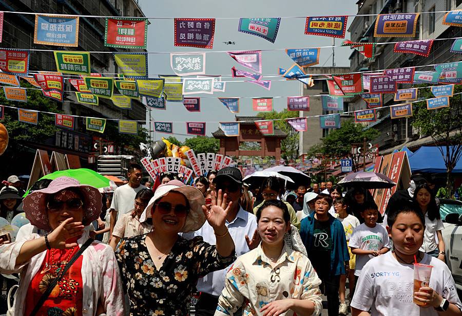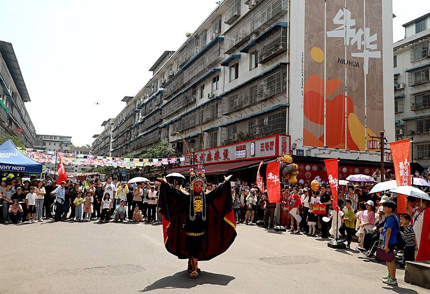 5月1日上午11点,美食街牌坊下,歌舞《千年盐城》演绎城市古韵,舞蹈《贰柒拾》展示巴适安逸的生活。周记麻辣烫——绿缘麻辣烫——八婆麻辣烫——雷四嬢蛋烘糕——各种花色的豆腐脑……跟着快闪巡游一路打卡美食一路吃,吃不完,根本吃不完。