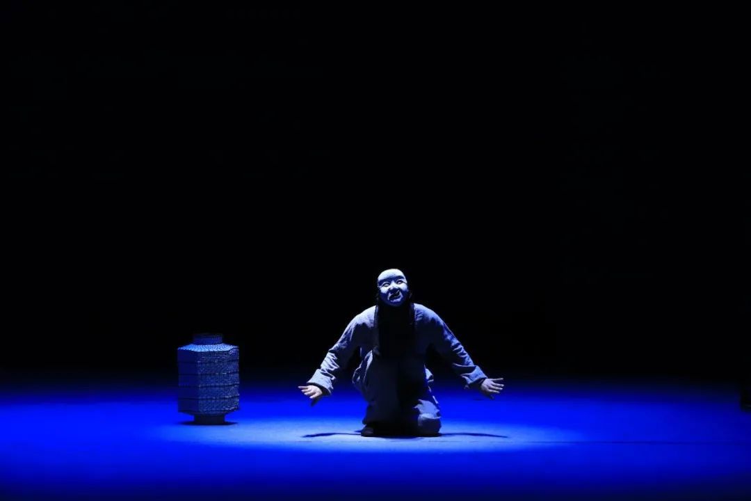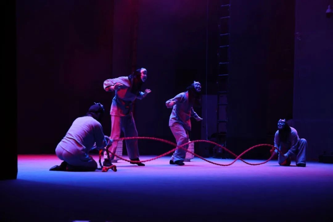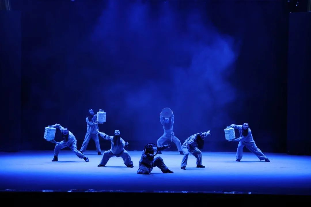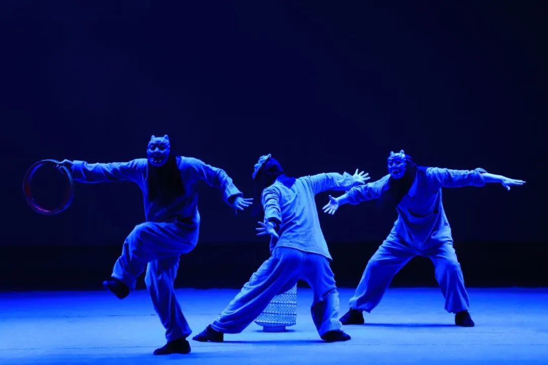 随着灯光渐暗,舞台上的神秘氛围逐渐弥漫开来。演员们以精湛的技艺和丰富的肢体语言,将故事娓娓道来。他们身着束袖束腿的布衣,头戴傩戏面具,通过京剧身段、皮影戏步法与现代舞韵律的完美结合,生动演绎水鬼与渔翁之间复杂的情感纠葛。