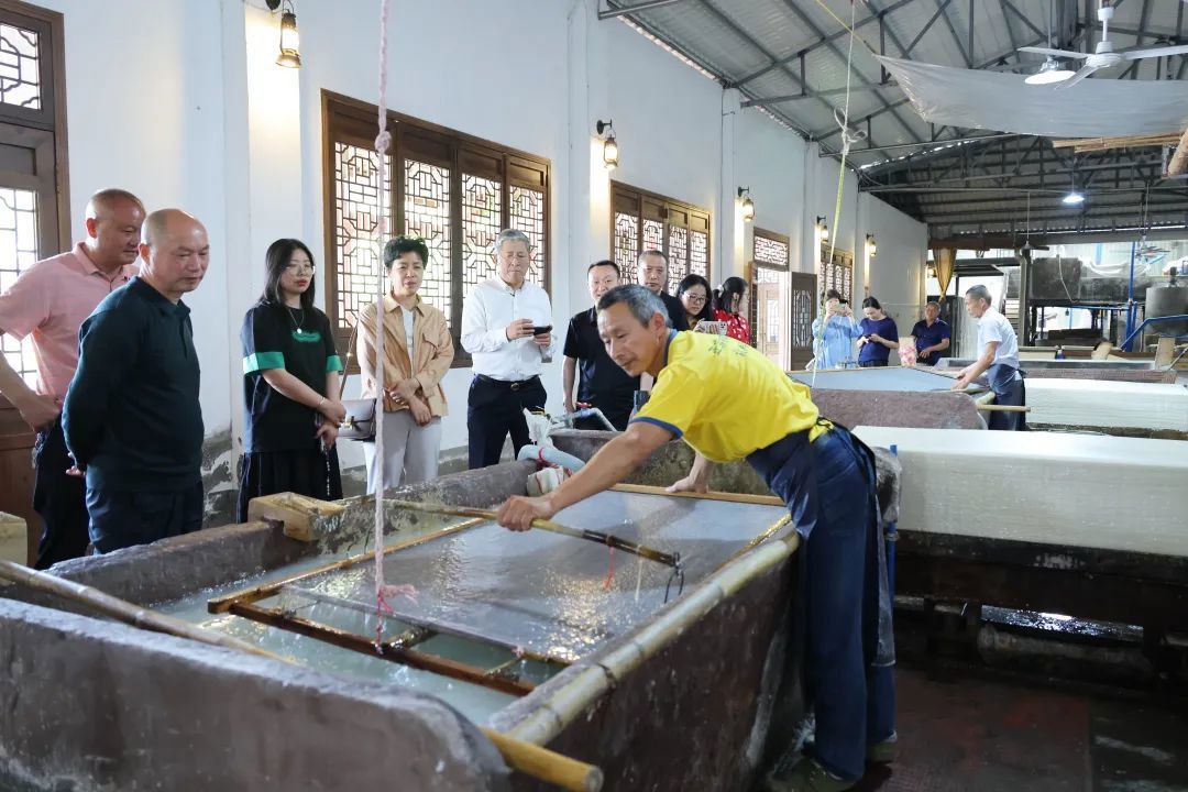 调研组一行来到夹江县马村镇大千纸故里,实地考察非遗竹纸制作技艺的传承保护情况,观摩竹浆抄纸到晾晒切纸等传统工艺环节,现场评鉴夹江书画纸的品质和性能。