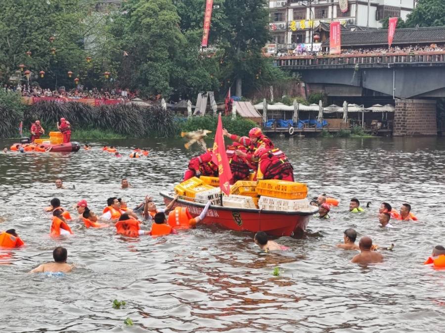 比赛结束后,传统民俗“抢鸭子”活动热闹登场,将现场气氛再次推向高潮。峨眉河上,工作人员分批次投放鸭子,选手们跃入水中追逐,鸭子四散奔逃,岸上观众笑声、喝彩声不断,为节日增添更多欢乐与惊喜。 (部分视频素材由乐山市市中区融媒体提供)