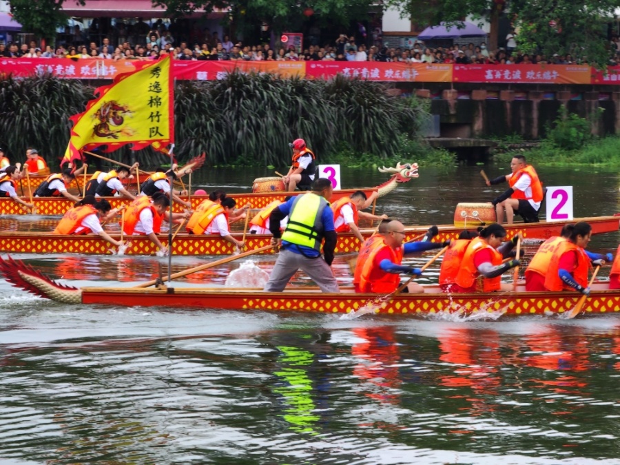 “加油加油……”随着发令枪响,3支龙舟如离弦之箭,飞驰而出,水花四溅。选手们整齐划一地奋力挥桨,鼓点声、呐喊声、击水声交织成激昂的乐章。