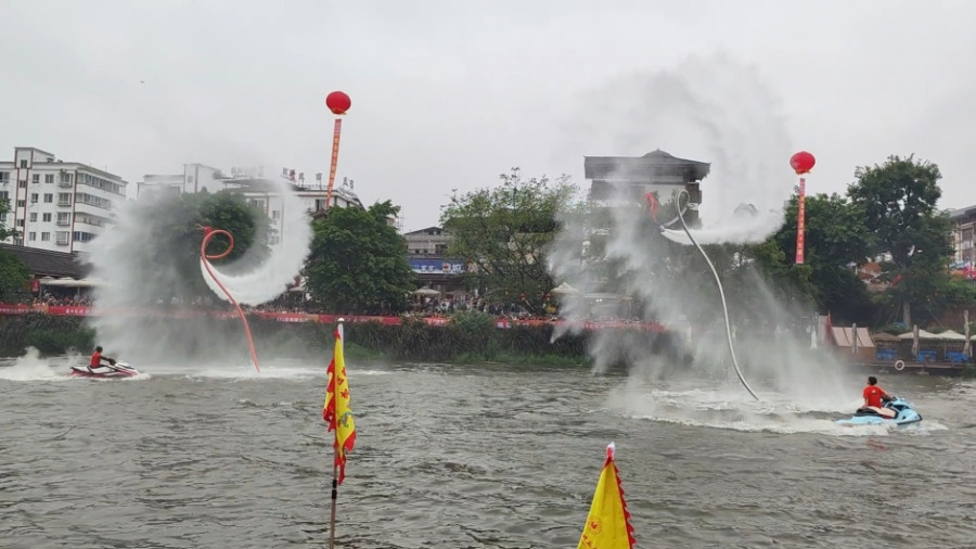 5月31日上午,乐山市市中区苏稽镇茹公桥——廊桥水域人声鼎沸。“水上飞人”酷炫出场,开启水上表演秀,并在空中展示“嘉‘舟’竞渡欢乐端午”横幅。2025年乐山市市中区第二届欢乐龙舟赛暨川渝地区龙舟邀请赛开幕。