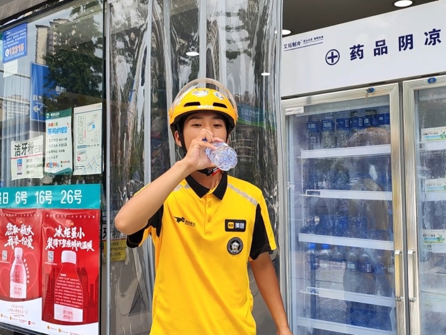 同步启用的还有嘉城药房(梧桐公馆店)点位。外卖员何懿洁发现了这处“爱心冰柜”,从冷柜里取出一瓶矿泉水,咕咚咕咚喝起来。他感慨随着气温升高,每天都要喝好几瓶水,忙的时候没时间买水,渴了只有忍着,“我要告诉我的工友们这里能取到冰水。”