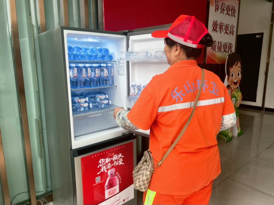 “我们店不远处就有一个垃圾回收站,每天在那附近工作的环卫工人约30人左右,他们对水的需求量一直比较大。”嘉州朱包子早餐店老板彭涛说道,这次“补货”之后,店里“爱心冰柜”里的水又能满足周边户外劳动者20天左右的饮水需求。