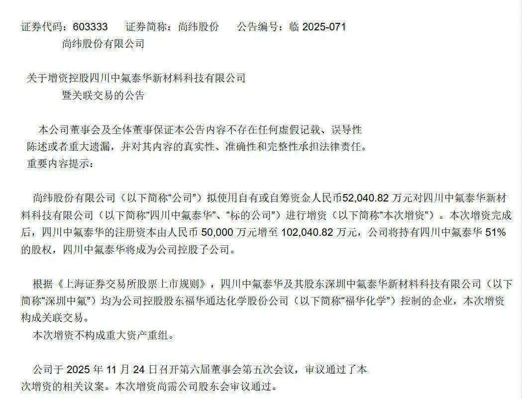11月24日,尚纬股份有限公司(以下简称“尚纬股份”)公告,拟对四川中氟泰华新材料科技有限公司(以下简称“中氟泰华”)进行增资,标志着其“特种电缆+电子化学品”双轮驱动战略迈出关键一步。此次战略投资精准契合乐山市打造千亿级绿色化工产业集群的发展方向,是乐山市深化产业转型升级、构建“241”现代工业体系的重要实践。