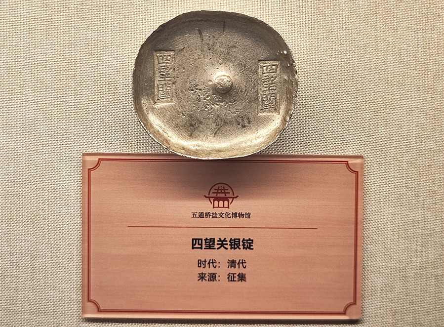 博物馆负责人乐军晏指着展柜里的一块银锭如数家珍:“这是清代的‘四望关银锭’。在中国古代,盐税是非常重要的财政收入。明清时期在五通桥四望关设立了盐政机构,银锭上的‘四望关’字样,就是标注这是在五通桥收取的盐税,熔铸成银锭。”