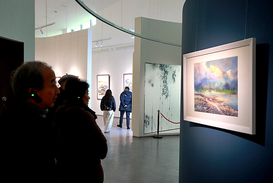 杨永福艺术馆主题为“水韵东西,墨彩和鸣”,共展出五通桥走出来的画家杨永福先生的55幅作品。杨永福的女儿杨静说,这些作品在故乡的美术馆展出,既是对父亲艺术生涯的致敬,更是他回馈家乡的方式,“欢迎大家带孩子们前来,照亮他们的成长之路。”