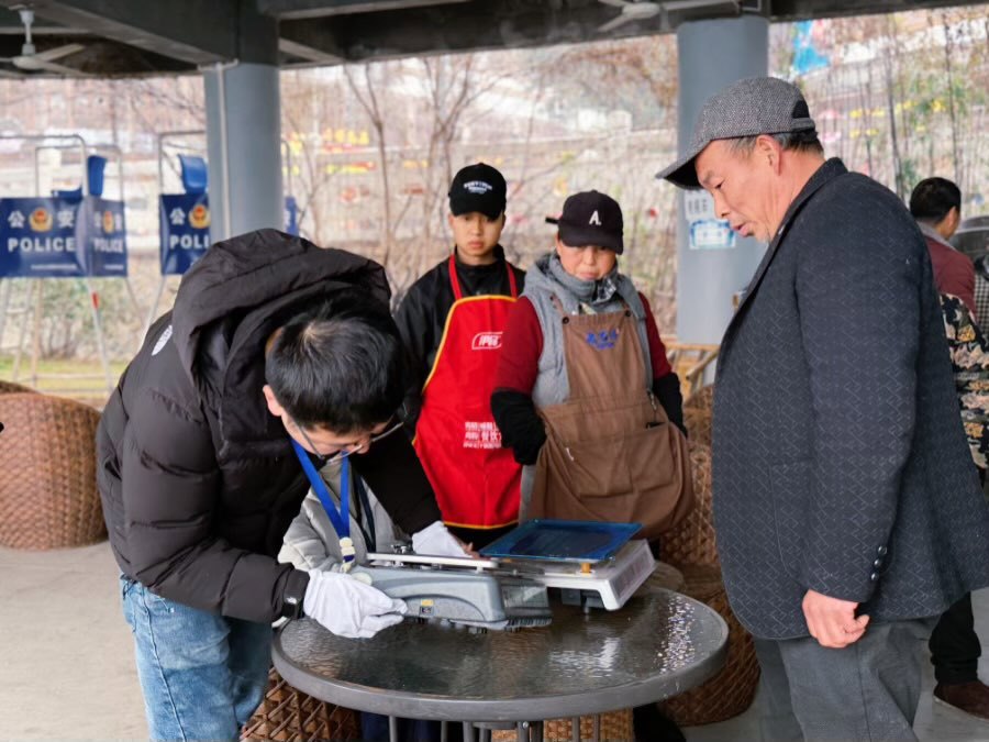 2月5日上午,乐山苏稽古镇悄然弥漫着浓浓的节日气息。戏台前的广场上,一场对商贩称重秤进行的集中“体检”正在展开。