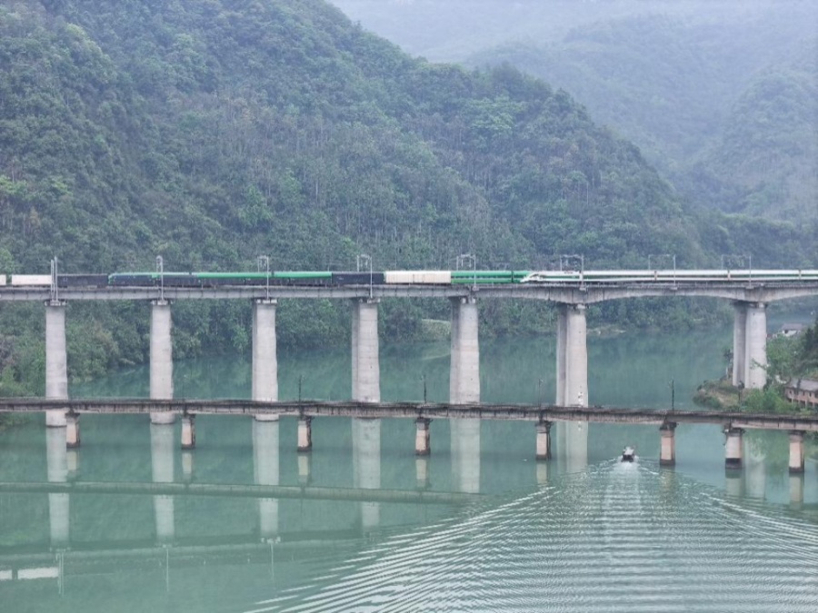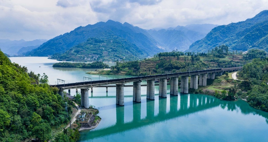 慢火车穿过库区。(杨博文 摄)
