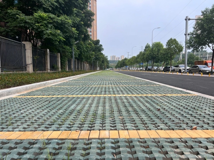 该停车场运用海绵城市理念,停车区域均采用植草砖铺设,雨水直接下渗,在保证透水的基础上又增添了绿意,让其成为城市“海绵体”的有机组成部分。
